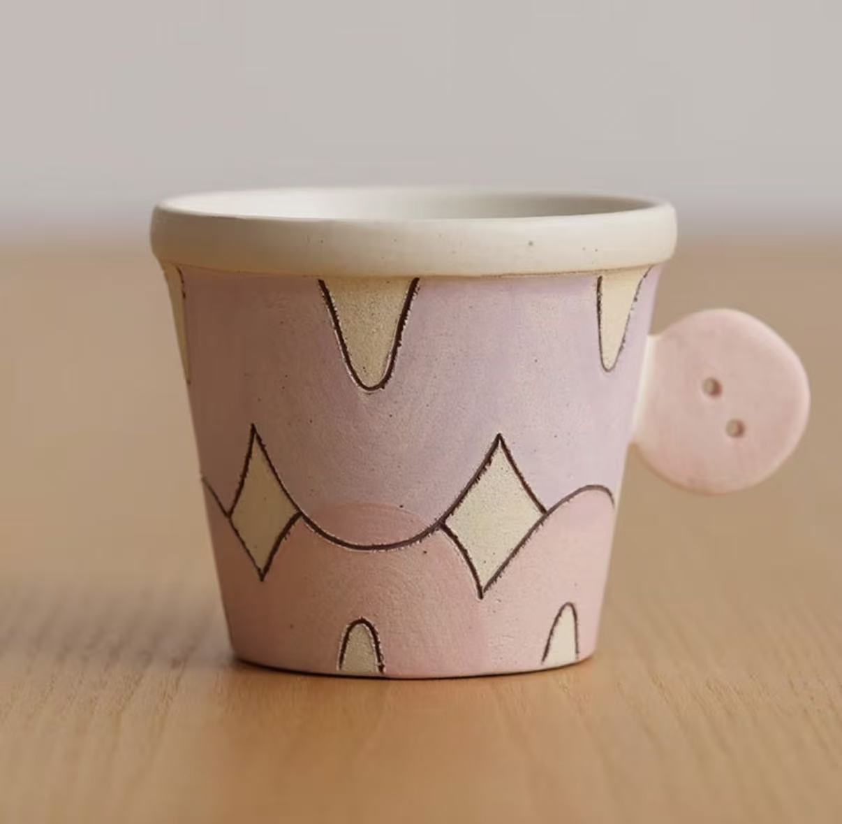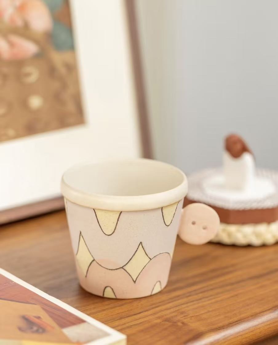 Each mug begins as a wheel-thrown body shaped slowly by hand. After partial drying, the button-shaped handle is individually sculpted, attached, and refined by the artisan. This multi-stage process requires patience and precision, ensuring structural strength while preserving the soft, organic character of handmade ceramics.
