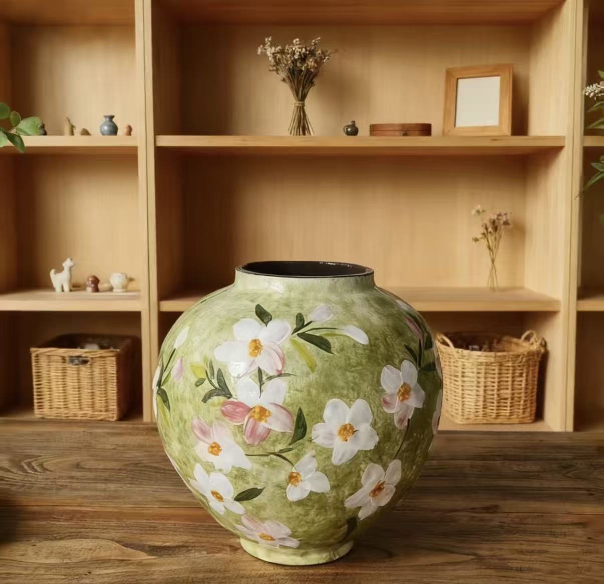 Complements a curated collection of hand-painted Jingdezhen vases.